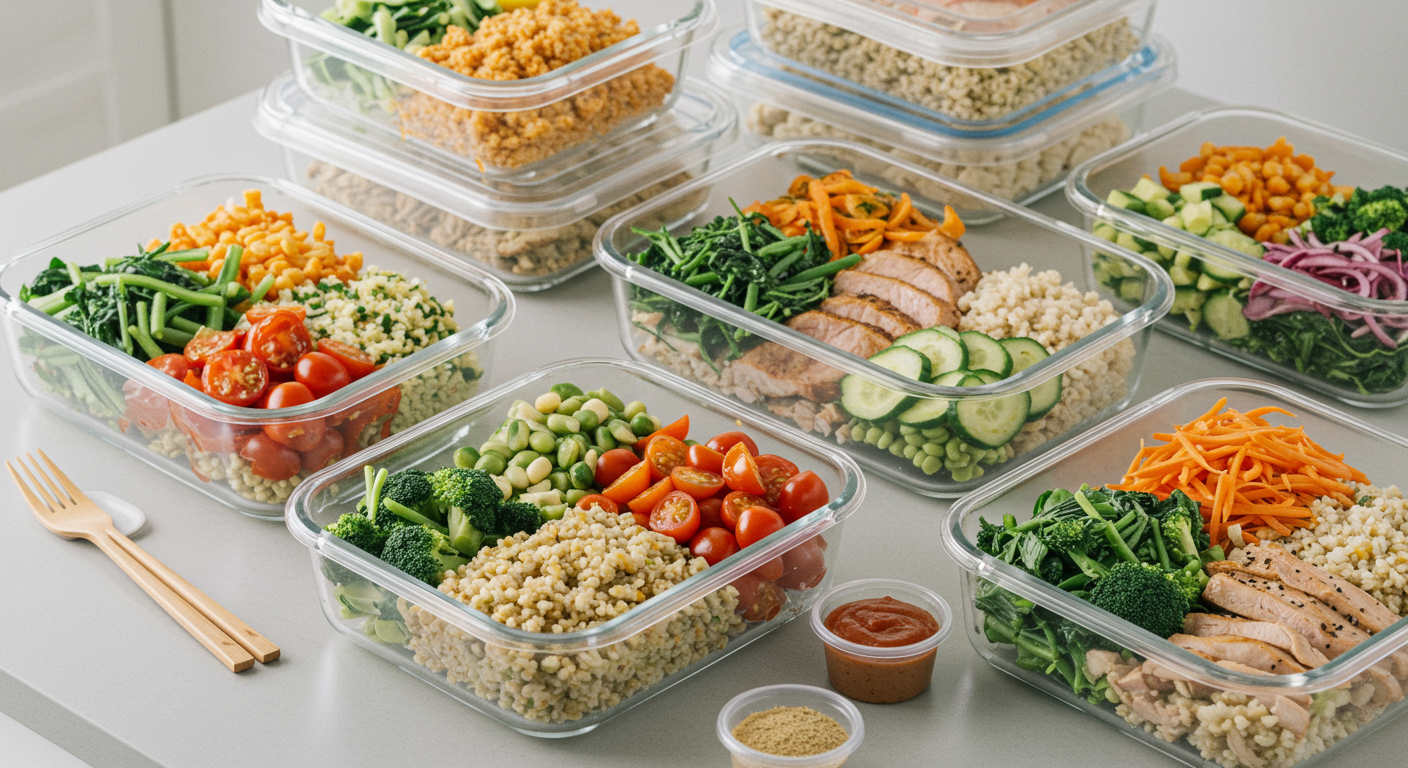 Reserve 1–2 horas no fim de semana. Cozinhe proteínas, asse legumes e prepare grãos simultaneamente.